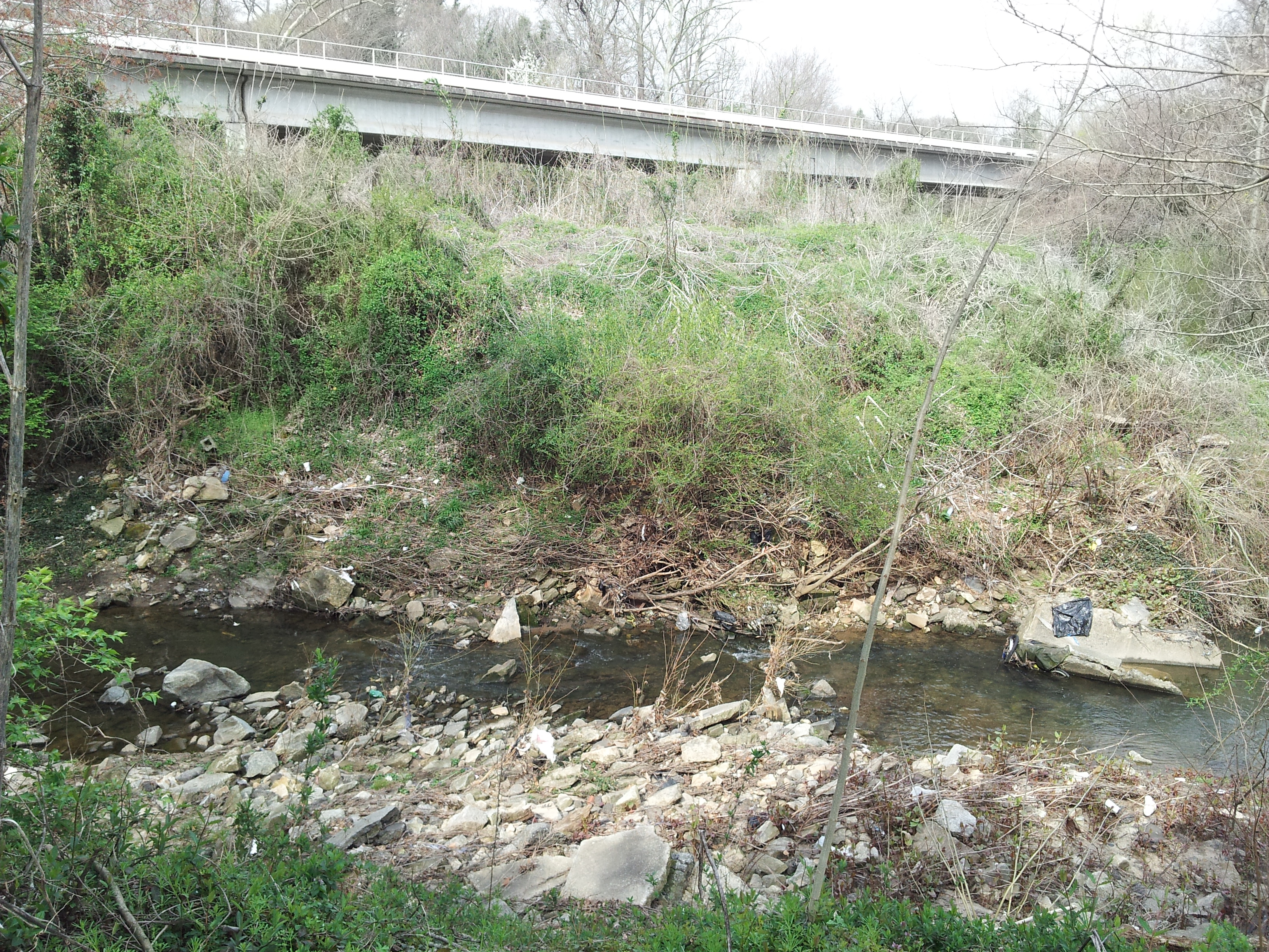 Some evidence of the creek bank degradation can be seen, where powerful water erodes the bank after being channeled through concrete tunnels and artificial creek beds.